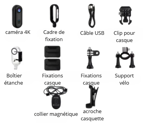 -La cameto inclut 10 accessoires : boîtier étanche, collier magnétique, cadre de fixation, support vélo, câble USB, etc. Pour plus d’informations, regardez la photo.